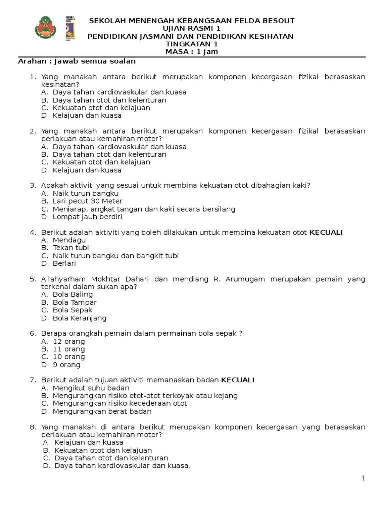 Soalan latihan pjpk tingkatan 3. Pendidikan jasmani dan kesihatan tingkatan tiga latihan bab dua. Seseorang individu dikatakan mempunyai kecergasan yang baik sekiranya. Gimnastik asaskemahiran asas lantunan:1)seat drop 2) back drop 3) hands and knees drop,4) front drop1) lompatan tuck. Bagi pdp kssm pjpk, penggunaan pembelajaran berasaskan inkuiri memberi peluang kepada murid untuk mempraktikkan kemahiran menyelesaikan masalah dan kemahiran membuat keputusan. Soalan pjk pt 2015 t3 1. Penerangan secara teori kemahiran gimnastik asas ( gimnastrada ) Peta bandar baru bangi pertandingan bercerita teks bercerita kisah nabi pertandingan bercerita kisah nabi pertukaran pegawai contoh surat rayuan pertukaran kkm person. Himpunan soalan ujian bulan mac tingkatan 3 2020 mengandungi keseluruhan ujian bulan mac untuk semua subjek untuk tingkatan 3. Soalan dan skema jawapan pjpk tingkatan 3. Peperiksaan tingkatan 3 pendidikan jasmani dan pendidikan kesihatan sulit. Sila jawab semua soalan di ruangan yang disediakan. 1 smk taman mount austin peperiksaan pertengahan tahun 2015 pendidikan jasmani kesihatan tingkatan 3 1 jam nama :